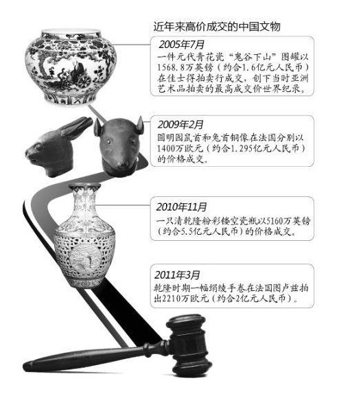 據(jù)聯(lián)合國(guó)教科文組織統(tǒng)計(jì),流失到中國(guó)境外的中國(guó)文物約164萬(wàn)件,分散在全世界47家博物館,海外民間的收藏預(yù)計(jì)是館藏的10倍。近年來(lái),中國(guó)文物成了拍賣市場(chǎng)的搶手貨,價(jià)格動(dòng)輒上千萬(wàn)。