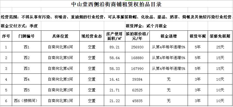 關(guān)注微信公眾號我公司受委托,定于2017年6月7日10時在徐州中山南路55號7樓拍賣徐州市中山堂一層西側(cè)沿街門面房租賃權(quán),共計6間,面積分別為16.41㎡、21.22㎡、21.71㎡、58.33㎡、58.64㎡、89.21㎡。租賃年限為3-5年。