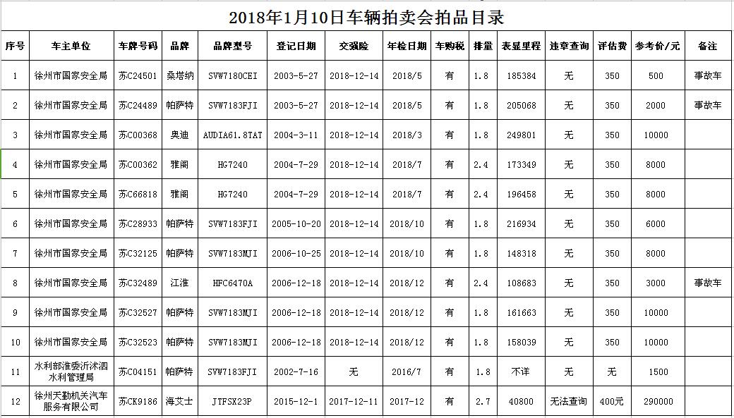 關注微信公眾號我公司受委托,定于2018年1月10日10時在徐州市中山南路55號三樓本公司拍賣大廳公開拍賣各型汽車11輛。主要有帕薩特6輛、雅閣2輛、奧迪1輛、桑塔納1輛、江淮1輛。