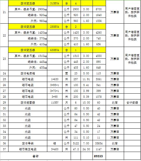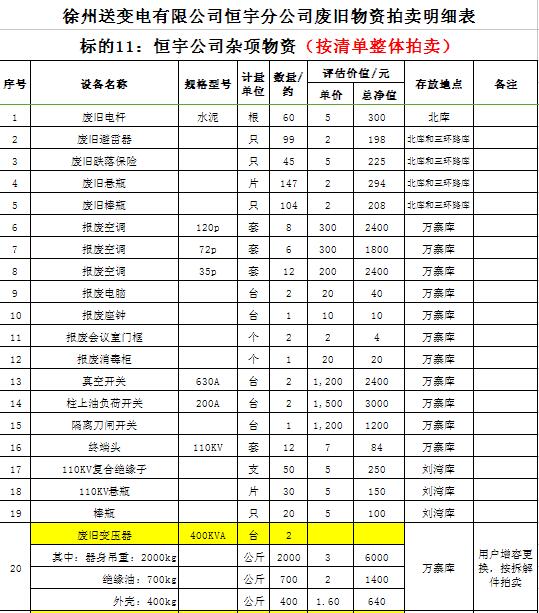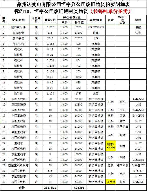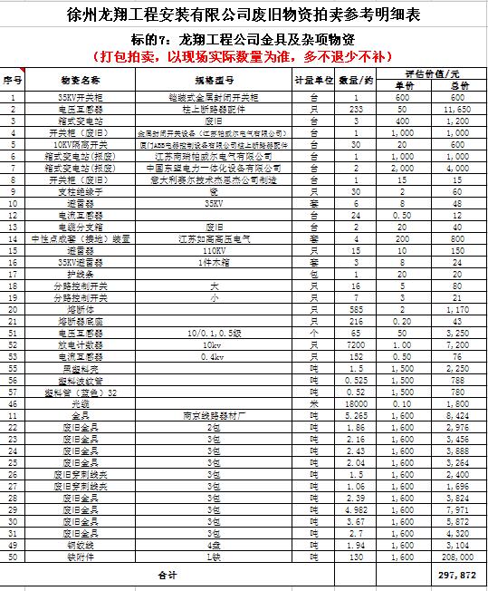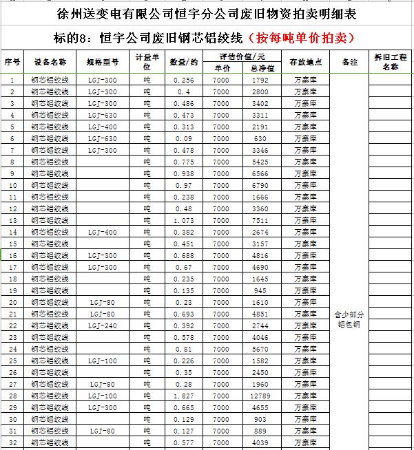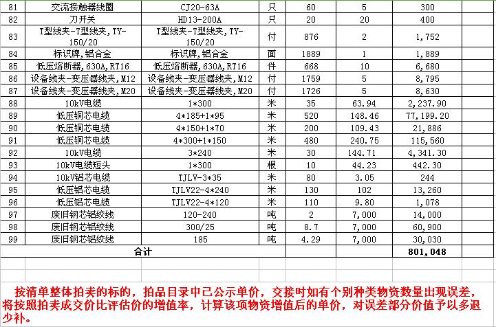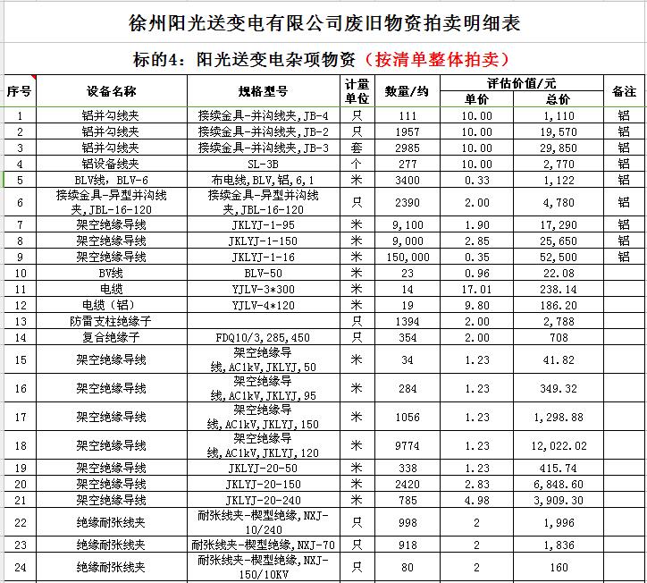 關(guān)注微信公眾號(hào)受委托,我公司將通過中國拍賣行業(yè)協(xié)會(huì)網(wǎng)絡(luò)拍賣平臺(tái)以網(wǎng)絡(luò)競價(jià)的方式公開拍賣以下公司廢舊電力物資。主要包含:廢銅排下腳料、廢不銹鋼、辦公設(shè)備等;架空絕緣導(dǎo)線、電纜、金具、角鋼塔、鋼芯鋁絞線、開關(guān)、互感器、變壓器散件等。