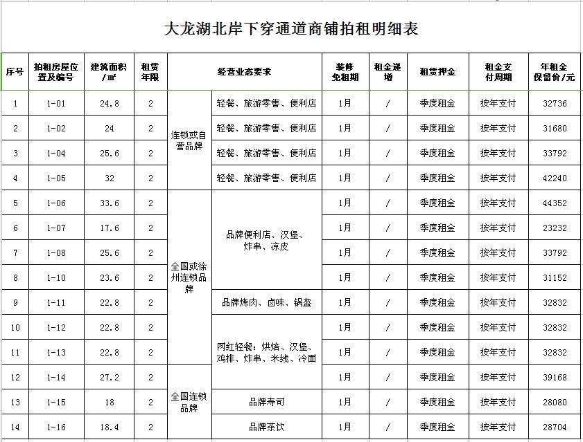 ②拍租順序自明細(xì)表序號(hào)14-1(16號(hào)商鋪-1號(hào)商鋪)依次競(jìng)拍,為保證商鋪經(jīng)營(yíng)業(yè)態(tài)的合理性,已競(jìng)拍成功的品類或品牌不再重復(fù)競(jìng)拍;